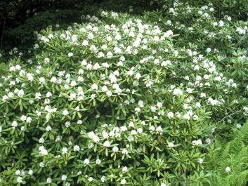 | Rhododendron "Maximum" are excellent privacy screens for shady areas that are not exposed to wind. They can reach 8'to 12" tall; and, they tend to spread sideways and often have branches rooting as they touch the ground. So, they can become a broad, dense screen in a shady spot. |