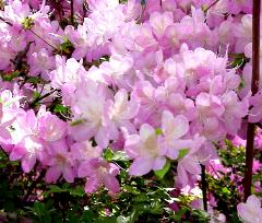 | Azalea "Dayspring" Flowers have white centers shading to a light purplish pink at the edges with a green-yellow blotch. |