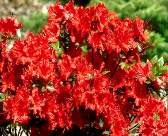 | Azalea "Johanna" True red, 2-1/4", single flowers are borne late season on a low, mounded, compact, 3-4' shrub. |